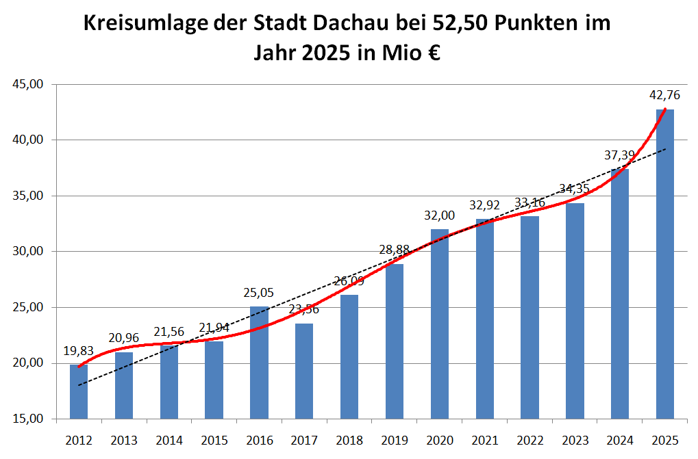( Die Kreisumlage ist eine Abgabe, die Gemeinden an den Landkreis zahlen müssen, um dessen Aufgaben zu finanzieren. Die Höhe wird vom Landkreis festgelegt und richtet sich nach der Steuerkraft der Gemeinden. Die Stadt Dachau hat keinen Einfluss auf die Höhe der Abgabe.)