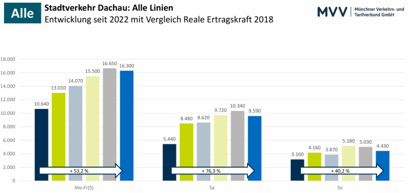 In der jüngsten Werkausschusssitzung von 25.03.2025 wurden einmal mehr die neuesten Fahrgastzahlen für die Dachauer Buslinien präsentiert. Gegenüber dem Basisjahr 2018 ergaben sich dabei eine Steigerungen der Fahrgastzahlen von werktags über 50 % und samstags von über 75 %. Der leichte Rückgang im Jahr 2025 dürfte wohl der Preiserhöhung beim Deutschlandticket geschuldet sein.