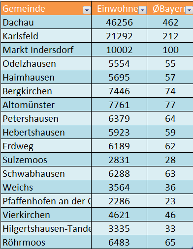 In der nachfolgenden Tabelle haben wir am Bayernschnitt (1 geförderte Wohnung pro 100 Einwohner) hochgerechnet was ein wünschenswertes Mindestmaß für jede Gemeinde ist. Wie oben schon erwähnt, die Stadt Dachau hat ihr Soll um das 3 fache übererfüllt.