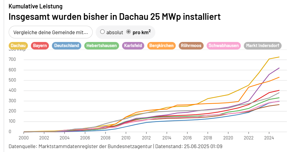 Schaut man nicht nur auf die jährlich installierte Leistung, sondern auf die kumulative Gesamtleistung, die in Dachau installiert ist, ergibt sich die Kurve in der folgenden Grafik. Wir liegen damit vor dem Durchschnitt in Deutschland, in Bayern, und aller Nachbargemeinden. Die Stadt Dachau hat sich als Spitzenreiter bei der PV-Nutzung etabliert, einen wesentlichen Anteil daran hat das Bündnis für Dachau, dass seit Jahren auf den Ausbau von Erneuerbaren Energien drängt.