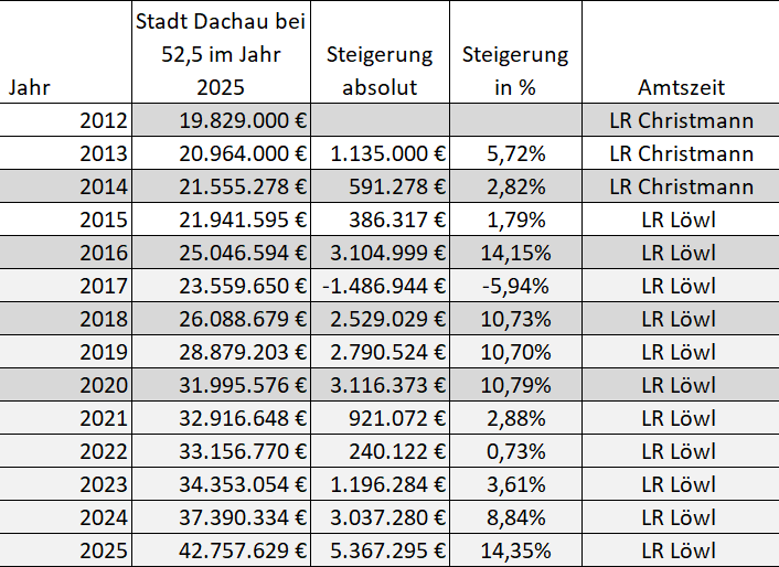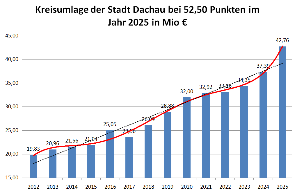 In der Stadtratssitzung am Dienstag den 29.7.25 soll beschlossen werden, den Haushaltsposten „Kreisumlage“ nachträglich um 1.685.829 € zu erhöhen. Die Stadt Dachau überweist damit 42,8 Mio € an den Landkreis – und nicht wie ursprünglich geplant 41,1 Mio €.