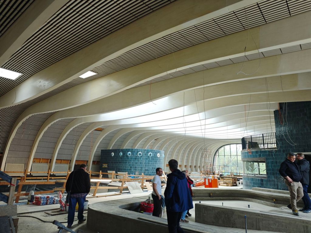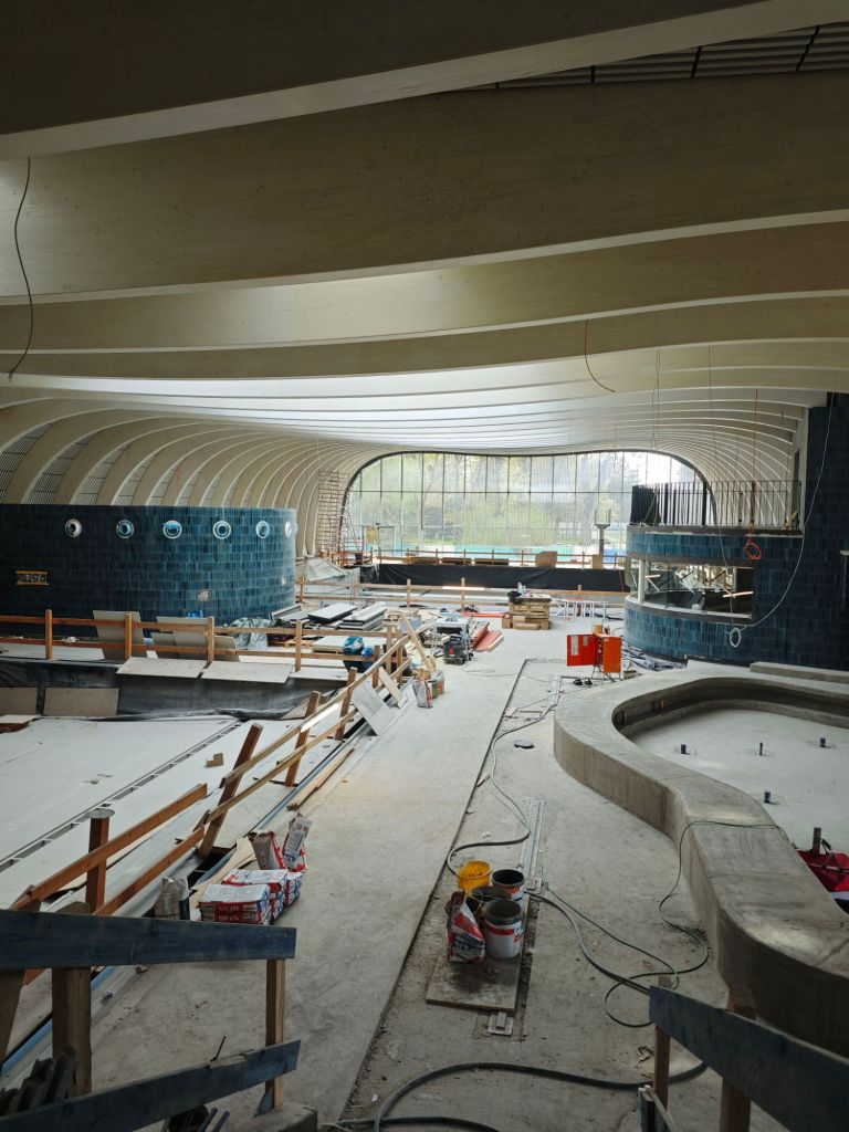 An vielen Details lässt sich bereits erahnen, wie das neue Bad aussehen wird. Die ausgewählten Materialien und Fliesen beeindrucken selbst im unfertigen Zustand. Besonders eindrucksvoll ist jedoch die Schwimmhalle: Das geschwungene Hallendach, die großzügige Raumwirkung, der Blick auf das Freibad und das helle Oberlicht schaffen ein außergewöhnliches Ambiente. Vier verschiedene Becken und zwei Rutschen bieten künftig Angebote für alle Altersgruppen.