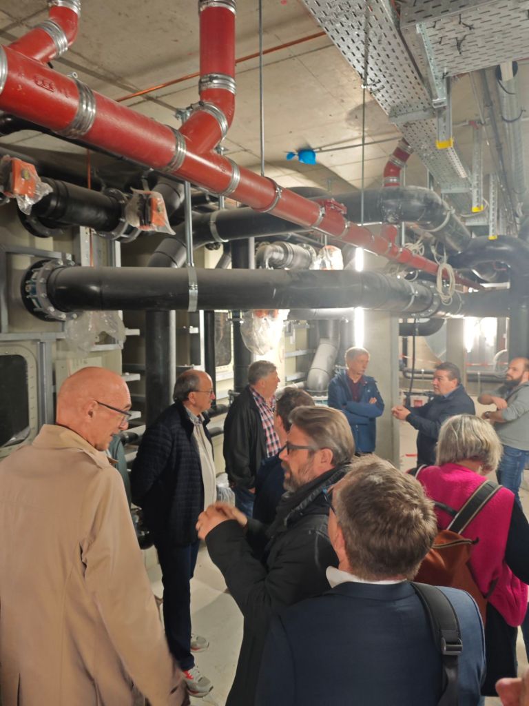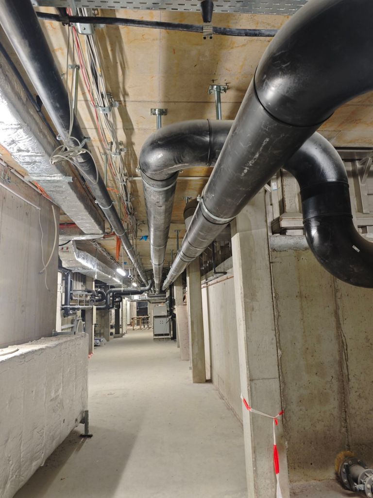 Nicht weniger beeindruckend ist ein Blick ins Untergeschoss des neuen Hallenbads. Die gewaltigen Rohrleitungen, Pumpen und Wasseraufbereitungsanlagen, die den Betrieb künftig sichern, zeigen die technische Dimension des Projekts. Hinzu kommen übermannshohe Lüftungsanlagen und Wärmetauscher für die Belüftung: Stündlich wird die gesamte Raumluft ausgetauscht. Das Blockheizkraftwerk liefert 350 kW Heizleistung und 250 kW elektrische Leistung und wird künftig auch das Freibad mitversorgen.